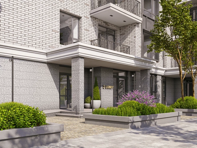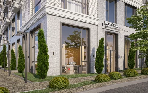 Широкоформатные окна с французским подоконником, лоджии с панорамным остеклением, входные группы на уровне земли.